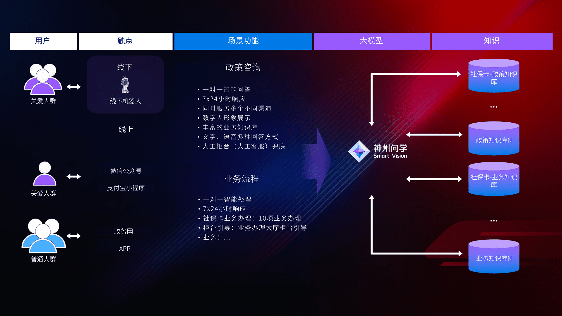 • 利用大语言模型+RAG技术,,,支持多轮对话,,,可识别多种同义词、、近义词,,,,精准理解关爱人群语义快速输出结果。。