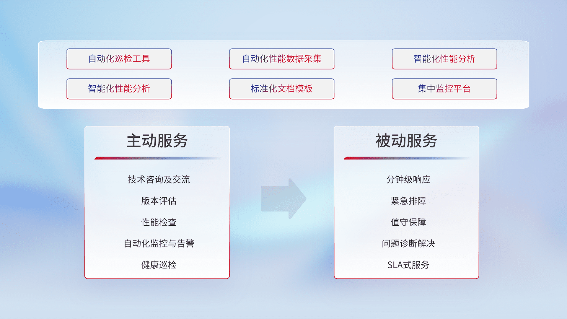 智能化工具和标准化文档,,保障服务质量,,提供主动服务(包含技术咨询、、版本评估、、、、性能检查、、自动化监控与告警、、、健康巡检)和被动服务包含(分钟级响应、、、、紧急排障、、、值守保障、、问题诊断解决、、、、SLA服务)。。。。