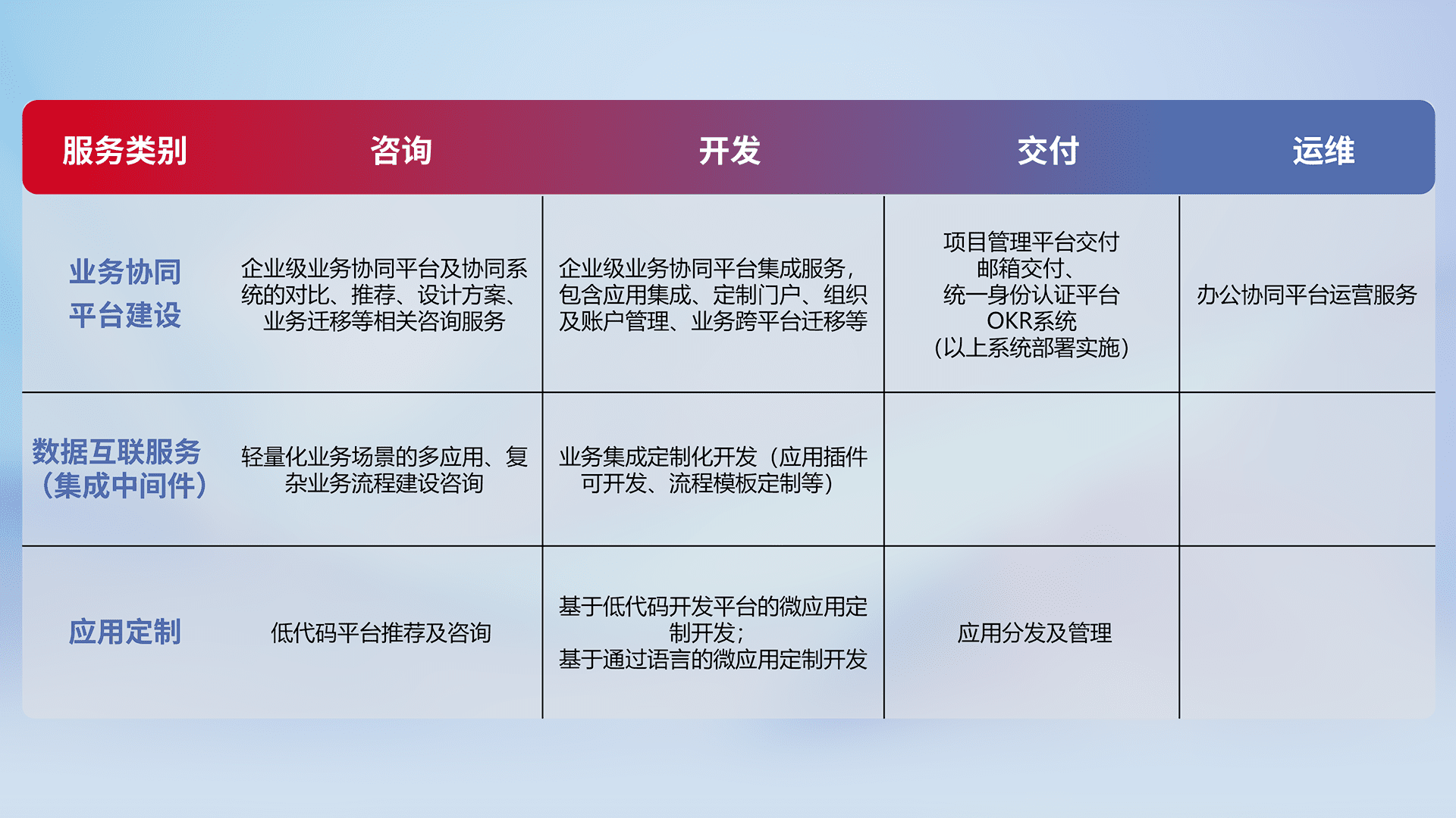 针对钉钉、、、、企微、、、IDaas等平台级产品提供产品的规划、、方案、、交付、、、定制化开发等服务,,实现如统一协同办公、、智能客户服务、、、混合会议管理、、、、智能数据查询、、、等业务场景,,,,实现数字化转型。。